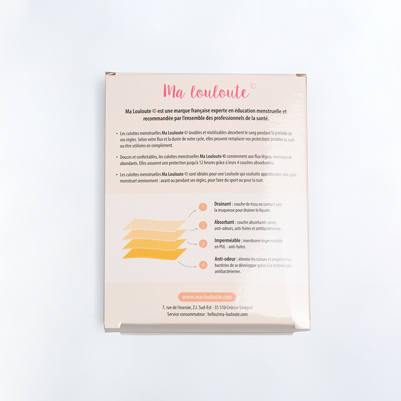 Conçue pour permettre aux jeunes filles de vivre leurs règles en toute tranquillité, la culotte menstruelle Ma Louloute est lavable et réutilisable pendant plusieurs années. Fabriqué à partir de matériaux naturels et sans aucun produit chimique ou toxique, le tissu ultra-absorbant situé à l'intérieur de la culotte capture et retient le sang menstruel pour un confort au sec.